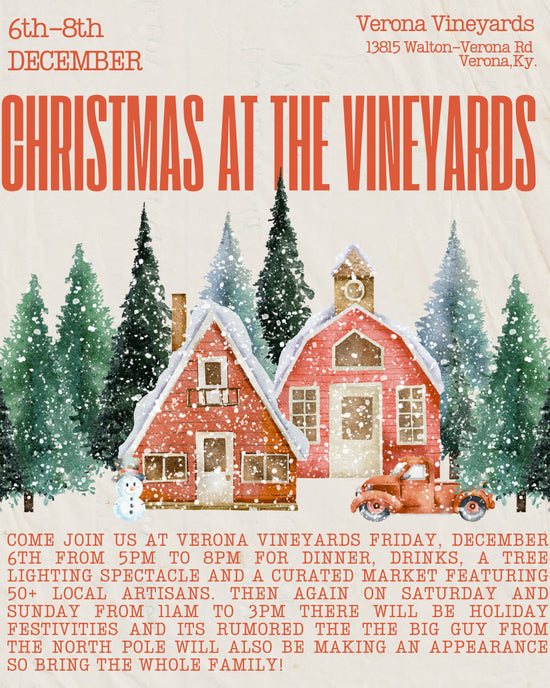 Join us and a host of local vendors and artisans for the 2nd Annual Christmas at the Vineyards event at Verona Vineyards. With the perfect setting for holiday shopping, Verona Vineyards offers a wide array of unique treasures, homemade wines, delectable food, and an overall great atmosphere. Enjoy a mid-morning filled with shopping, laughter, and memory-making this holiday season.