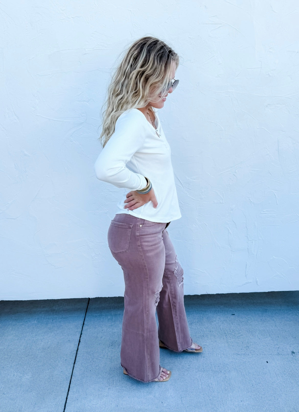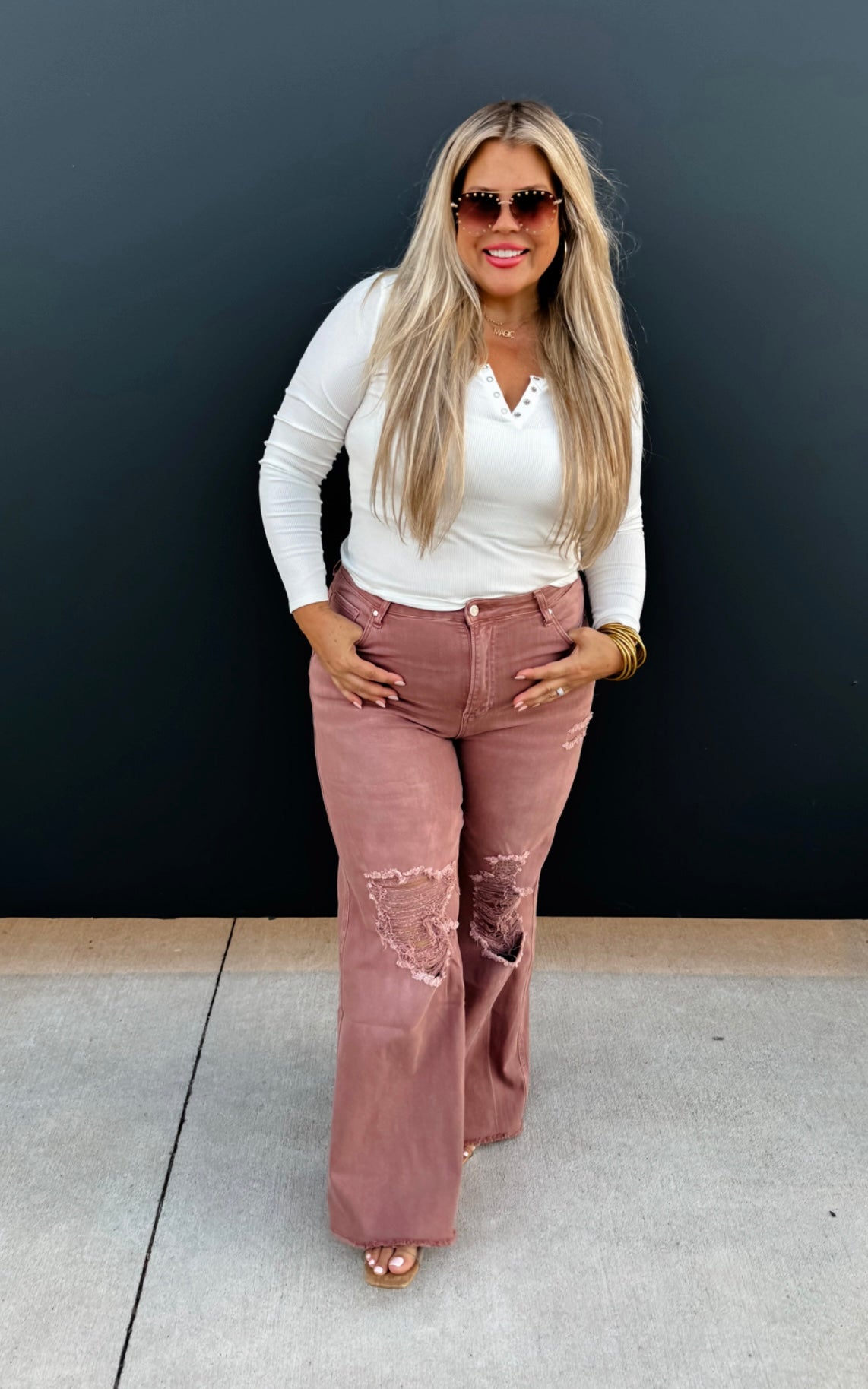 PREPARE TO FALL IN LOVE! These colored denim "wide leg Dad" jeans are FINALLY here, and they are PERFECTION! The stretch is amazing! Think "Judy Blue" stretchy style denim but way better! Made with premium quality denim with heavy distressing on the knees.
