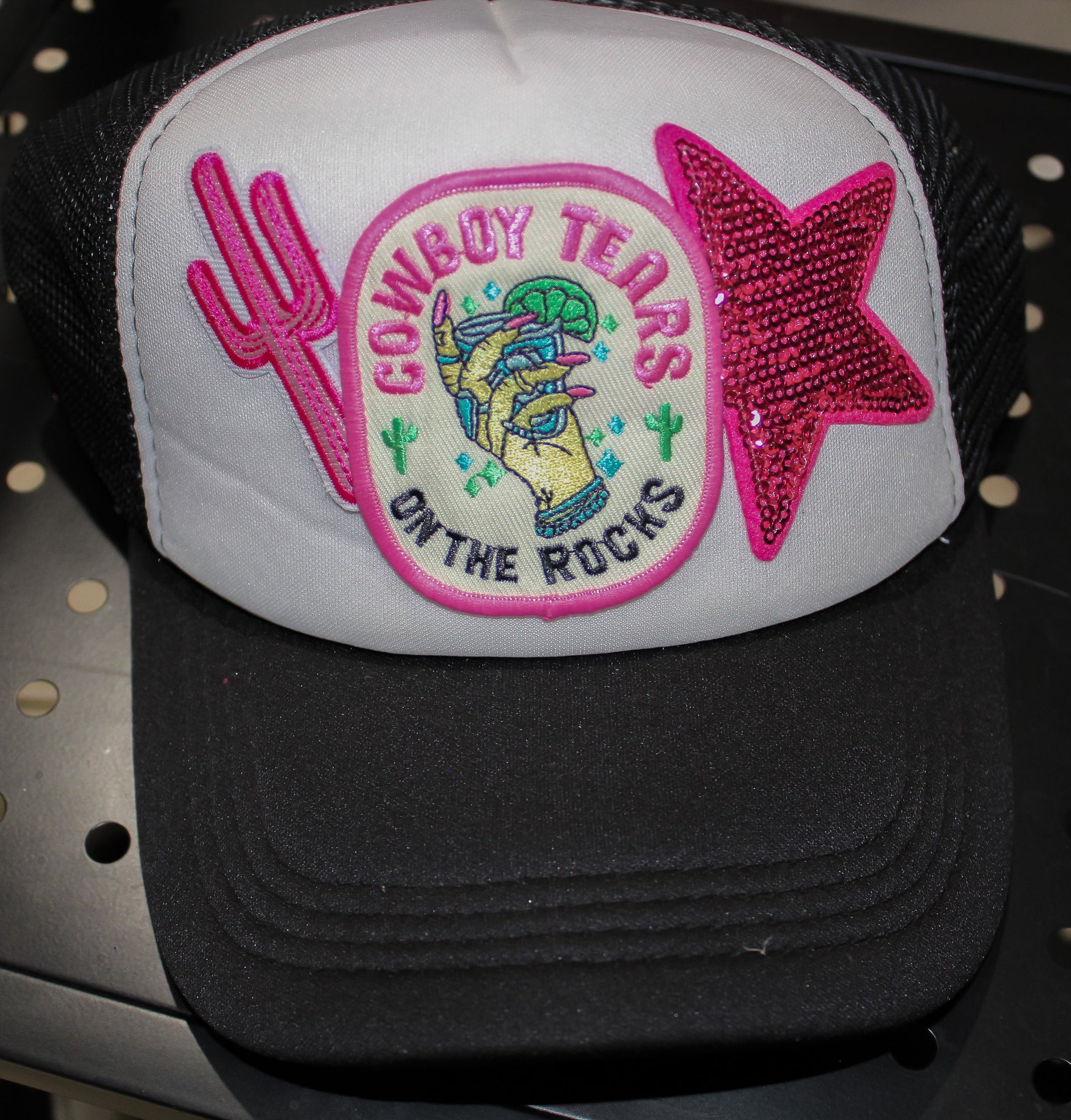 Custom made hat with Pink Cactus, Cowboy Tears on the Rocks, and Pink Sequin Star patches