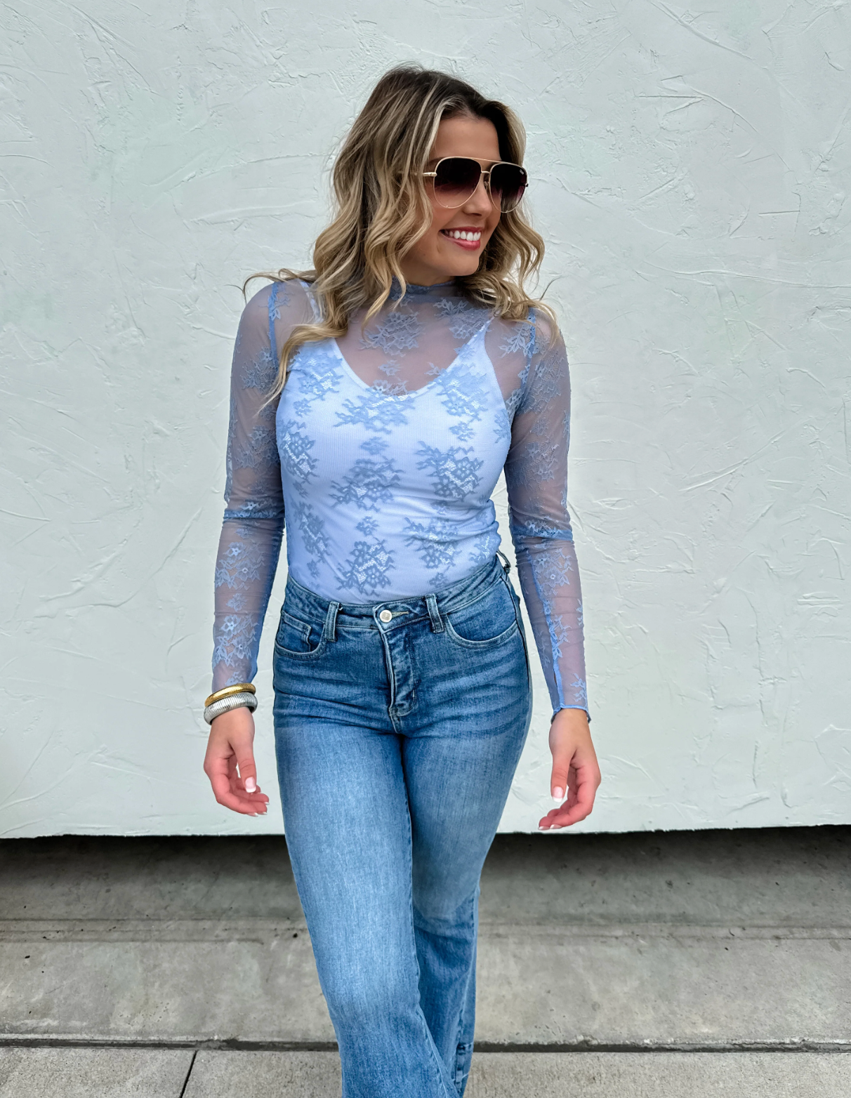 Super cute for layering, this sultry stretchy lacey mesh long-sleeve top features a totally sheer design with floral embroidery. Dainty mock neck and thumbhole details. Relaxed fit with a fluttery hemline.