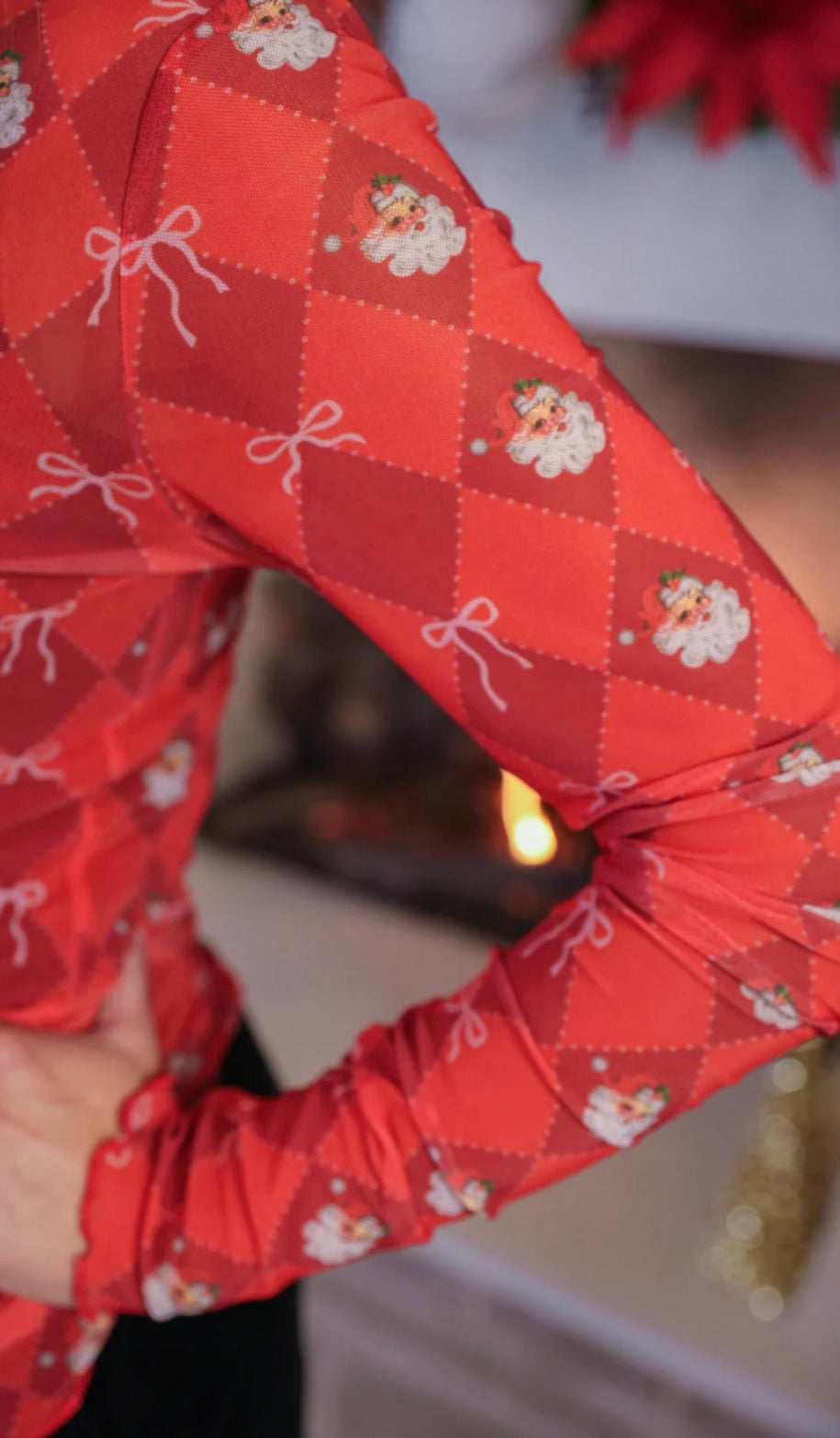 Santa's Signature Bow! This playful top features lettuce hems, a mock neckline, and a sheer mesh material that can be layered under or over any outfit. Don't miss out on this trendy addition to your holiday wardrobe!